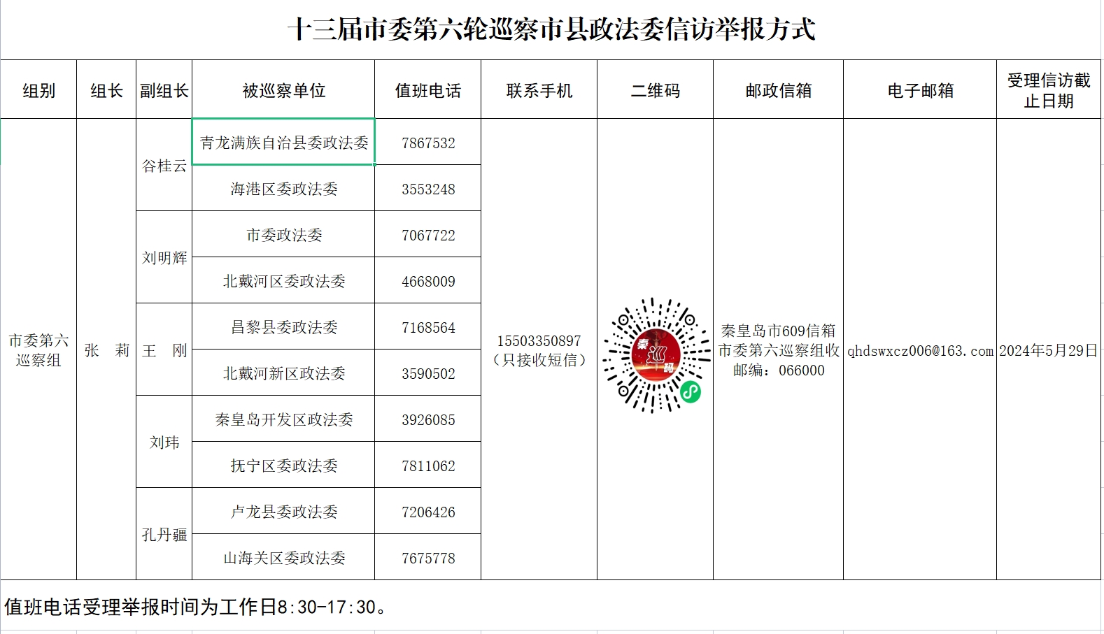 据悉,市委第六巡察组在市县政法委巡察期间设值班电话、邮政信箱、联系移动电话、电子邮箱、联系信箱、“秦码巡”二维码接受党员干部群众的举报。根据有关规定,市委巡察组主要受理反映市县政法委领导班子及其成员、下一级党组织领导班子主要负责人和重要岗位领导干部问题的举报和反映,重点是关于违反政治纪律、组织纪律、廉洁纪律、群众纪律、工作纪律、生活纪律以及违反中央八项规定精神等方面的问题反映。其他不属于巡察受理范围的信访问题,将按规定转交有关单位或有关部门处理。