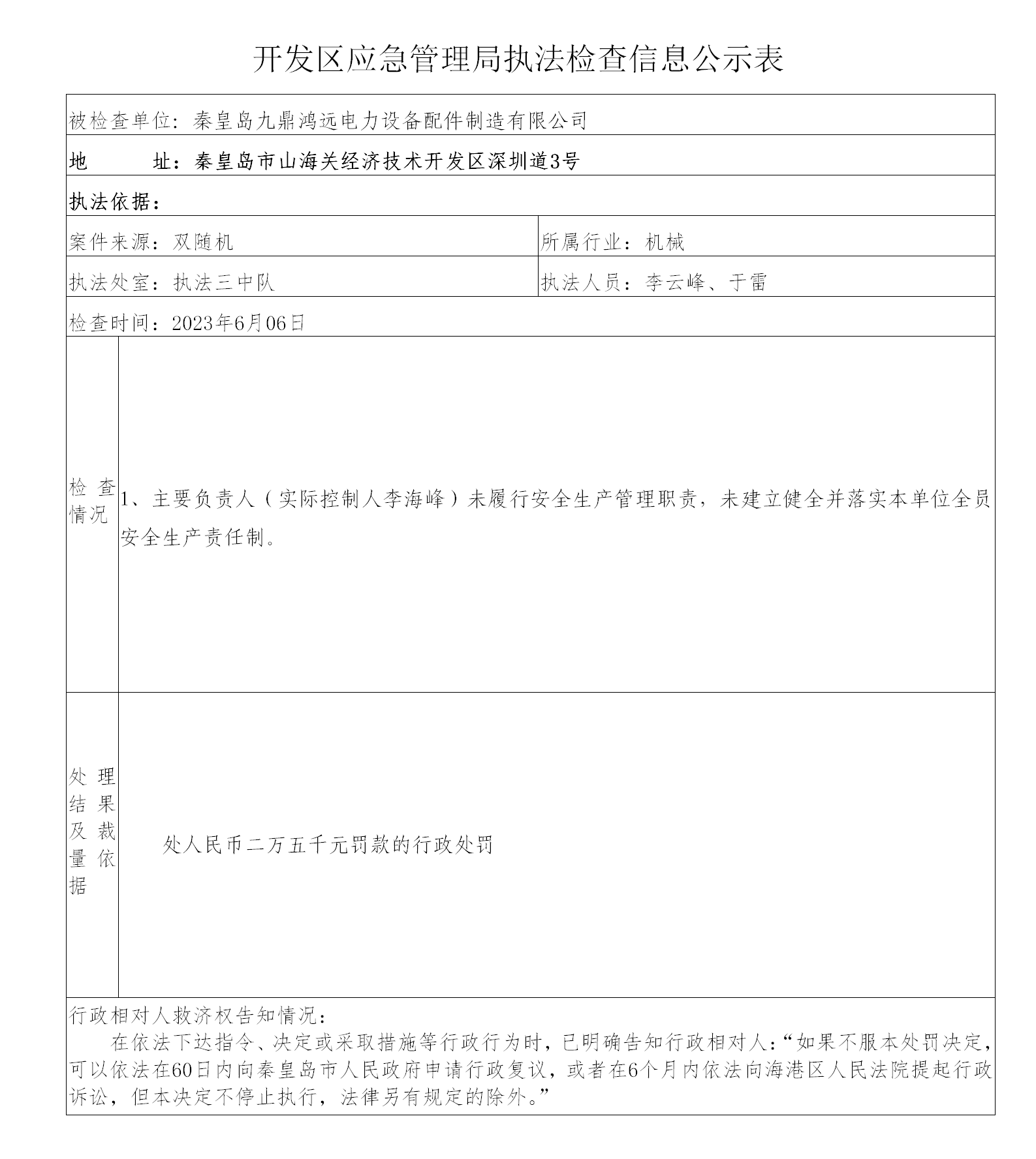 秦皇岛经济技术leyu乐鱼·官方web站登录入口应急管理局执法信息公示(秦皇岛九鼎鸿远电力设备配件制造有限公司)