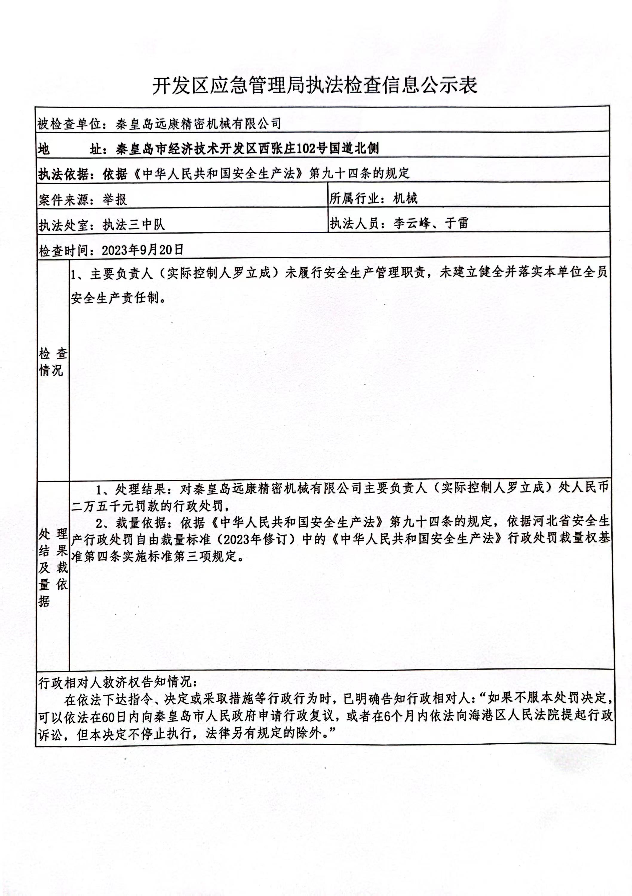 秦皇岛经济技术leyu乐鱼·官方web站登录入口应急管理局执法信息公示(秦皇岛秦皇岛远康精密机械有限公司)